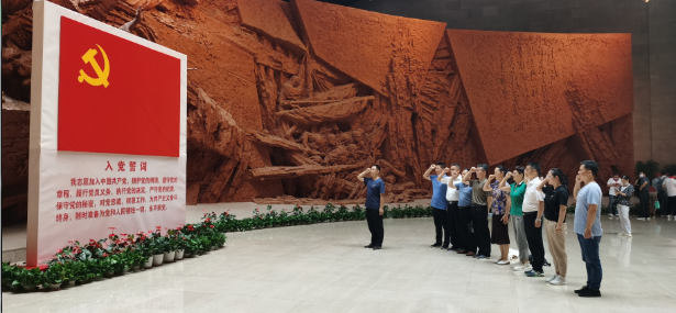 在纪念馆一楼大厅,面对鲜红的党旗,全体党员高举右手重温入党誓词,进一步增强党员的党性观念,激励每名党员规范自己的言行,牢记党的宗旨,履行党员义务,做一名合格党员。