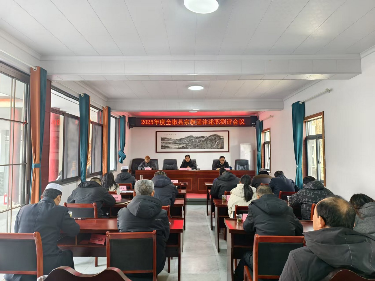12月16日,全椒县在六镇镇神山寺召开2025年度宗教团体述职测评会议。县佛教协会、道教协会、伊斯兰教协会、基督教“三自会”四个宗教团体负责人围绕思想政治引领、场所规范管理、中国化场所建设和全面从严治教等重点工作述职,与会人员对宗教团体进行民主测评。各镇宗教工作分管领导、各宗教团体负责人及班子成员40余人参会。