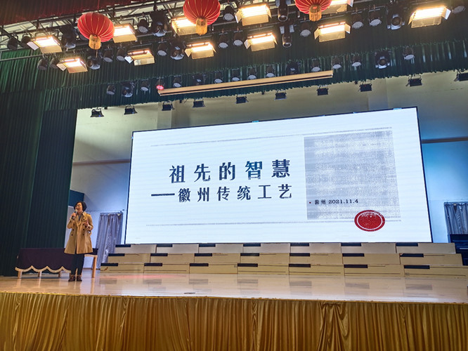 在来安县汊河镇碧桂园外国语学校,张悦以《祖先的智慧--徽州传统工艺》为题,向数百名同学们述说、展示了徽州悠久的文化历史特别是徽州文房四宝的特点和制作工艺。