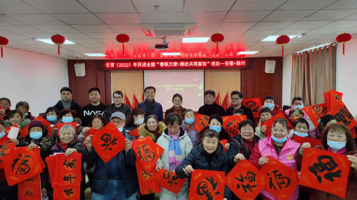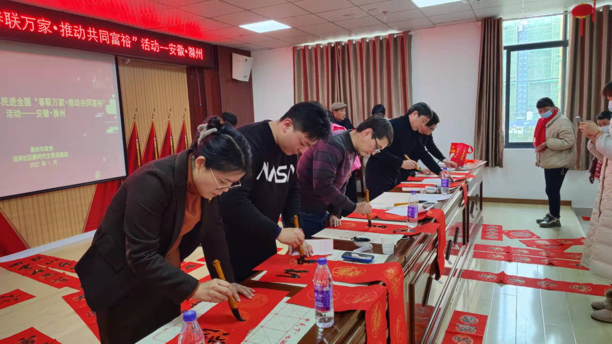 妙笔生花送祥瑞,翰墨飘香迎新春。1月12日,民进滁州市委开明书画摄影联谊会积极响应民进中央和民进省委“春联万家”的活动号召,来到琅琊区沿河社区开展“春联万家,推动共同富裕”活动。民进滁州市委专职副主委郭韬,市政协委员、滁州书法家协会主席、民进会员范振海,文化支部副主委武玉靓等现场为社区居民写春联。