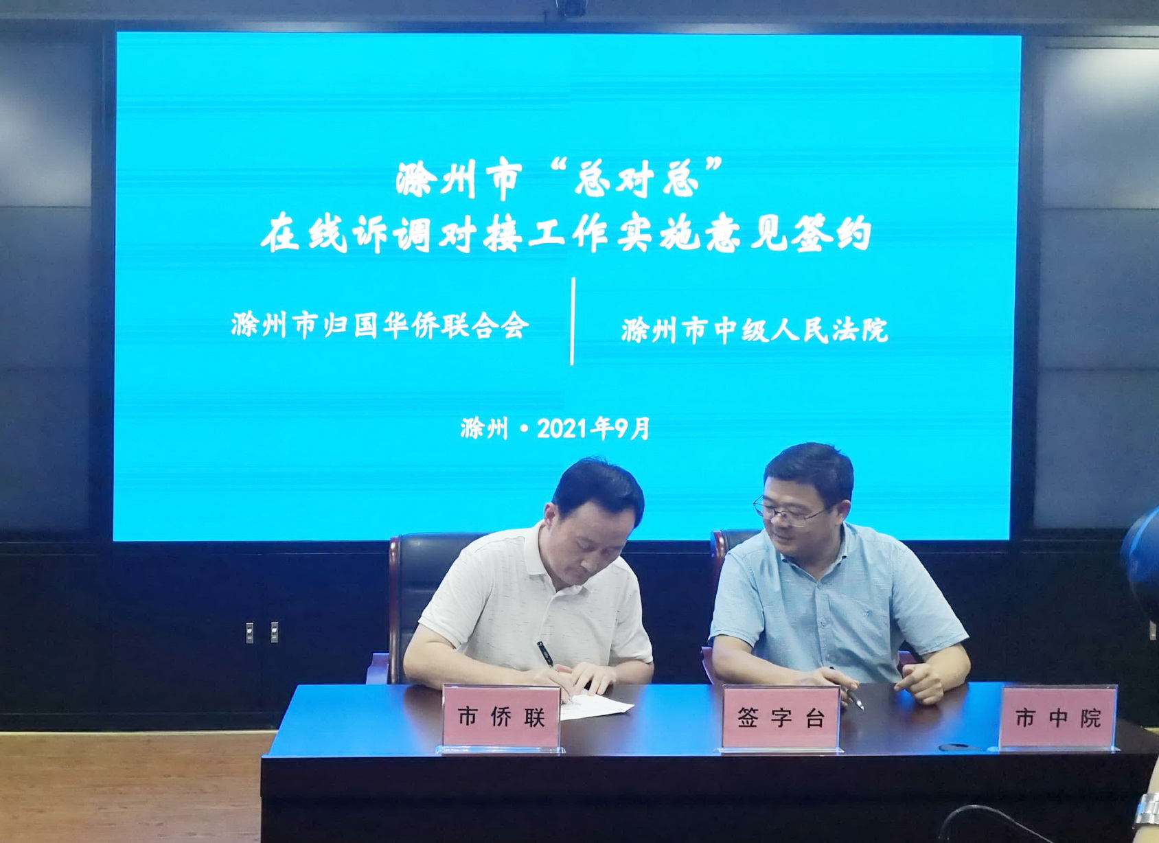 9月7日下午,滁州市侨联与滁州市中级人民法院“总对总”在线诉调对接工作实施意见成功签约。市侨联主席曹之淮、市中院副院长李传水共同在《实施意见》上签字。